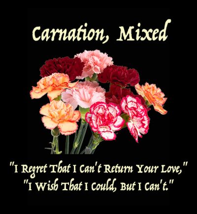 A mixed bouquet of Carnations can carry three possible messages. In addition to the symbolism of each colour -- a White Carnation for pure love, a Pink Carnation for friendship leading to romance, and so forth -- there are meanings given to mixed colour bouquets. If all the Carnations are solid colours, "The Answer is Yes." If all are striped and variegated, the meanings are "Fickleness," "No," or "I Refuse." But if the bouquet contains both solid and variegated Carnations, the message is, "I Regret That I Can't Return Your Love," "I Wish That I Could, But I Can't."