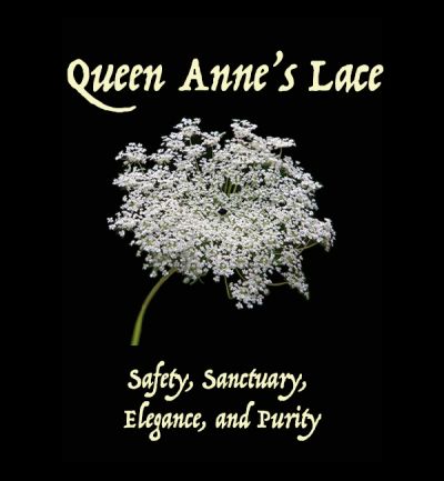 Queen Anne's Lace is the American name for Wild Carrot, the same species as the domestic Carrot, but with a woodier root. Named in honour of Britain's Queen Anne (1665 - 1714), its umbelliferous head of tiny white flowers does resemble fancy lace, and each lacy grouping bears one red flower, called the ruby, which represents a drop of blood that fell when Queen Anne pricked herself with a needle. Woven into wreaths and garlands it symbolizes Safety and Sanctuary; presented as a bouquet it offers praise to the recipient's Elegance and Purity.