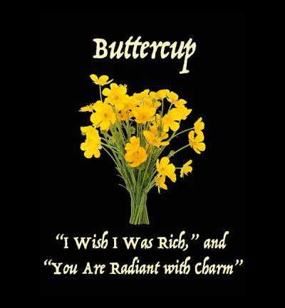 File:Buttercup.jpg|The Buttercup, also known as the King Cup or Water Crow-Foot, is in the Ranunculus genus, which contains a phenomenal 1,750 species, most of which bear crowns of golden-yellow or white five-petalled flowers. Buttercups are toxic to most animals, but are a food source for the Hebrew Character Moth. This moth has a mark like the Hebrew letter "nun" ("fish") on each wing; both the letter and the word protect against the evil eye. The meaning of the Buttercup in old books is "I Wish I Was Rich," but modern writers say it means, "You are Radiant with Charm." | |||