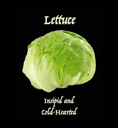 File:Lettuce.jpg|Lettuce, a plant in the Aster family, is grown to eat fresh in salads. There are many varieties, some bitter, some mild, some bright green, some whitish, and some tipped with maroon on the edges. From Wild Lettuce, which resembles a Dandelion, to Loose-Leaf, Oak-Leaf, Romaine, and Bronze-Leaf Lettuce, all forms of Lettuce are chilled to use in salads. The one variety most Americans are familiar with is the pale, compact ball of the nearly flavourless Iceberg Lettuce. To serve your suitor Iceberg Lettuce as a salad is to call the recipient Insipid and Cold-Hearted. | |||