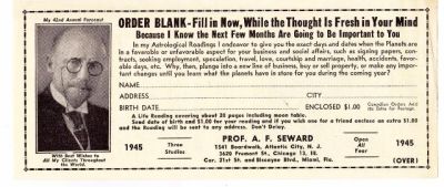 Display Ad 19 -- No Title Pay-Per-View - Chicago Tribune - ProQuest Archiver - Feb 15, 1959 PROF A. F. SEWARD 325 N.E. 21st St Miami Fla. THE STANDARD ASTROLOGICAL READING OF THE WORLD. CLIPTHIS AD FOR FUTURE REFERENCE 83C ...