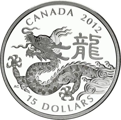 Canada, 2012, 15 Dollars, 1 Oz. of .999 Silver, Coin, obverse, left-facing dragon, emerging from mist and clouds, "Canada 2012", "15 Dollars.